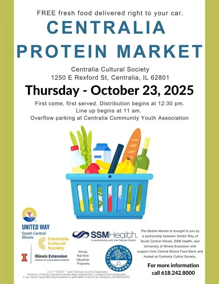 This event is made possible thanks to a partnership between United Way of South Central Illinois, SSM Health, and the University of Illinois Extension, with support from Central Illinois Food Bank and hosted at Centralia Cultural Society.