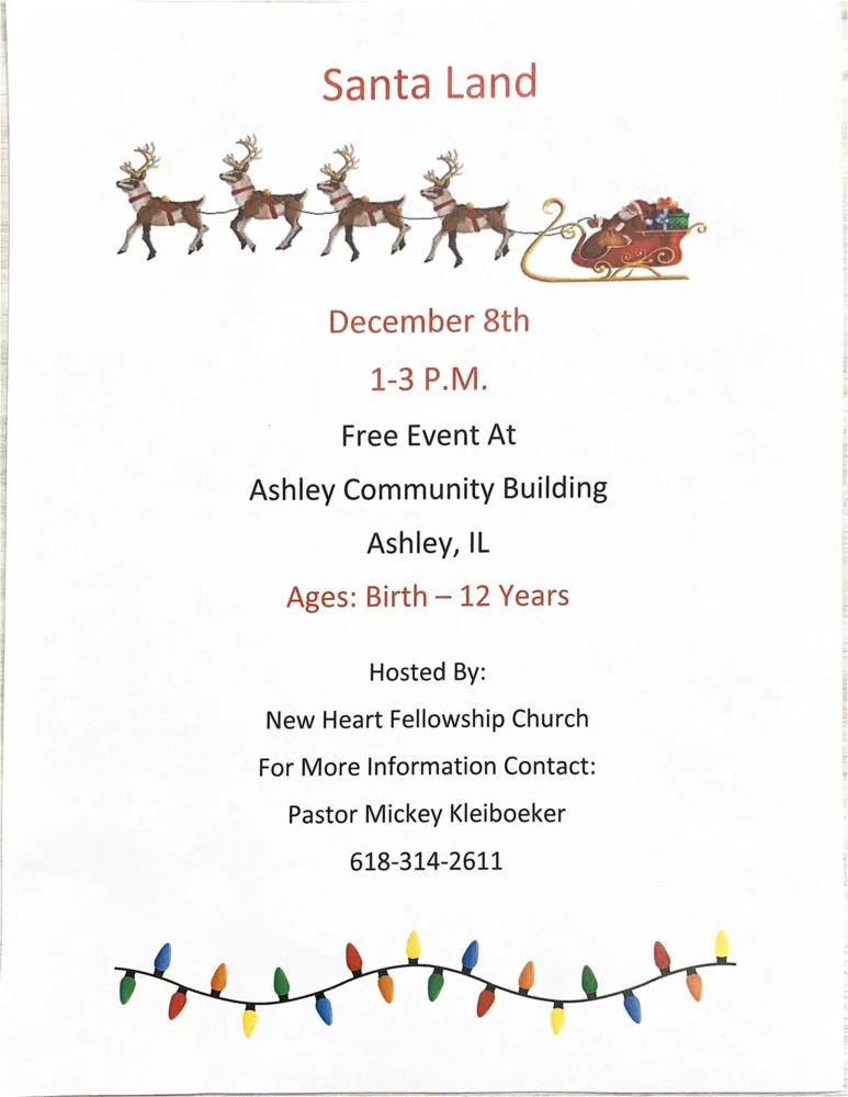 A Free Event hosted at the Ashley Community Building in Ashley, make plans to bring the kids and attend Santa Land! Hosted by New Heart Fellowship Church.